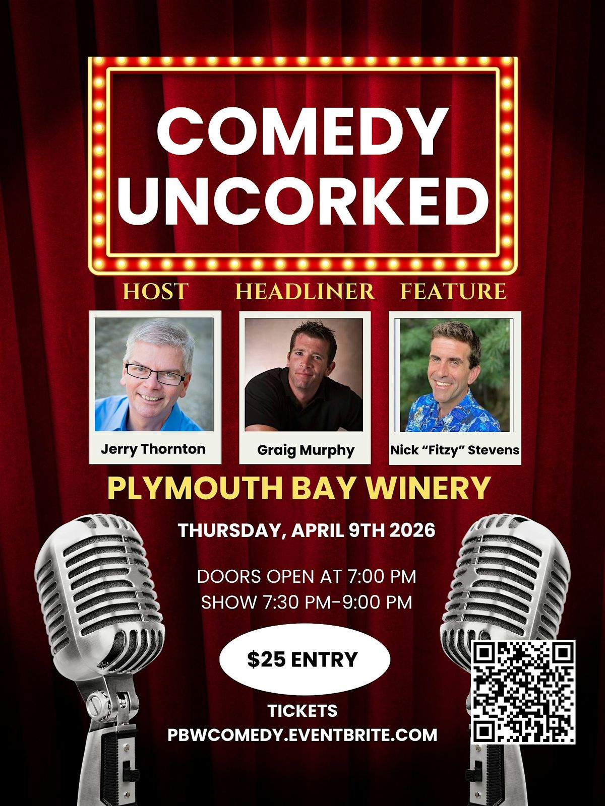 Get ready to sip, snack, and snort-laugh your way through the night at Comedy Uncorked! Join us at Plymouth Bay Winery for an unforgettable evening of wine, wit, and nonstop entertainment.