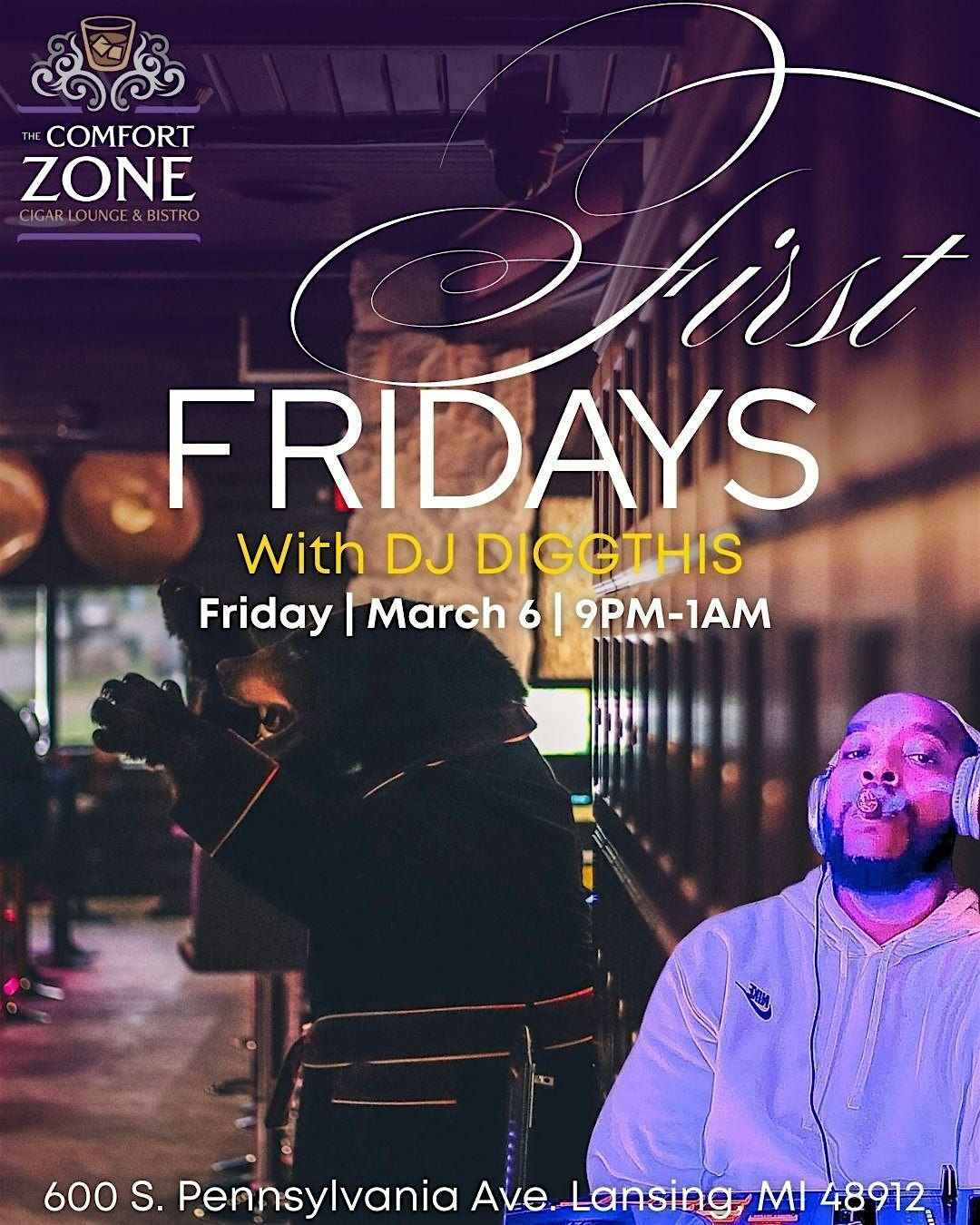 Welcome to Comfort Zone First Fridays featuring the one and only DJ DiggThis! Join us at The Comfort Zone Cigar Lounge & Bistro for a night of great music, good vibes, and awesome company. Get ready to dance, relax, and enjoy some top-notch tunes in a cozy atmosphere. Don't miss out on the fun - mark your calendars for the first Friday of the month and come hang out with us!