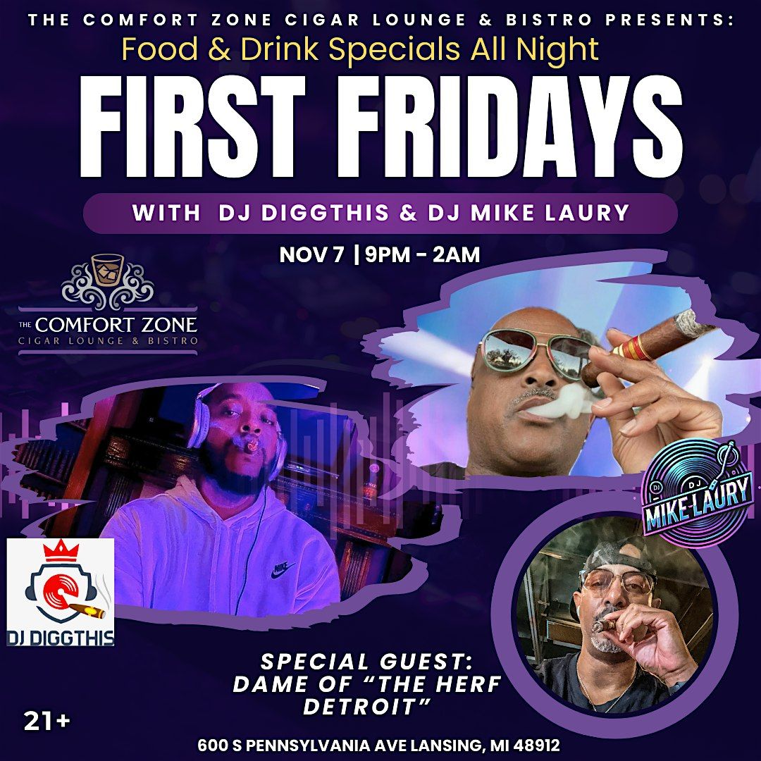Welcome to Comfort Zone First Fridays! Join us at The Comfort Zone Cigar Lounge & Bistro for a night of great music and vibes with DJ DiggThis, DJ Mike Laury, and Dame. Get ready to dance, relax, and enjoy some top-notch entertainment. Don't miss out on this awesome event!