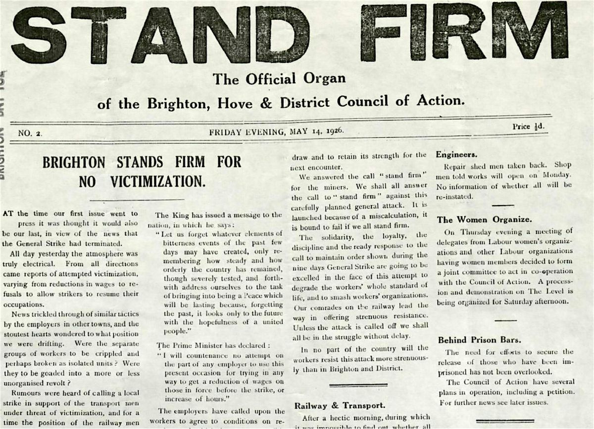 This event organised by Brighton and Hove Trades Council will include talks on the general strike of 1926 with speakers including Judy Cox, co-author of Revisiting the General Strike of 1926: When Workers Were Ready To Dare (2026) and a film showing of 'The Battle of Lewes Road' (1984) and discussion of how it was made by Brighton History Workshop with Chris Nichols and Roger West. We will have a full programme here with full list of speakers and timings once it is ready.