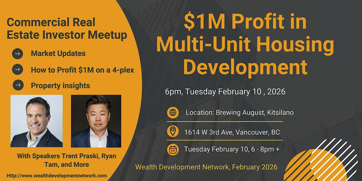 Wealth Development Network (Vancouver, BC) continues our 2026 series of real estate investing sessions, networking, and workshops for residential and and commercial real estate, with a presentation and networking event in February. Learn how to make $1M profit developing a 4-plex, come ready to meet others, and progress your goals for 2026 with fellow RE professionals. Hosted at Brewing August in Kitsilano.