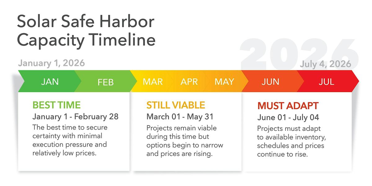 Info: An overview of planning timelines and Safe Harbor requirements, explaining how acting early in 2026 secures the full 30% ITC, preserves pricing and scheduling flexibility, and reduces project risk.