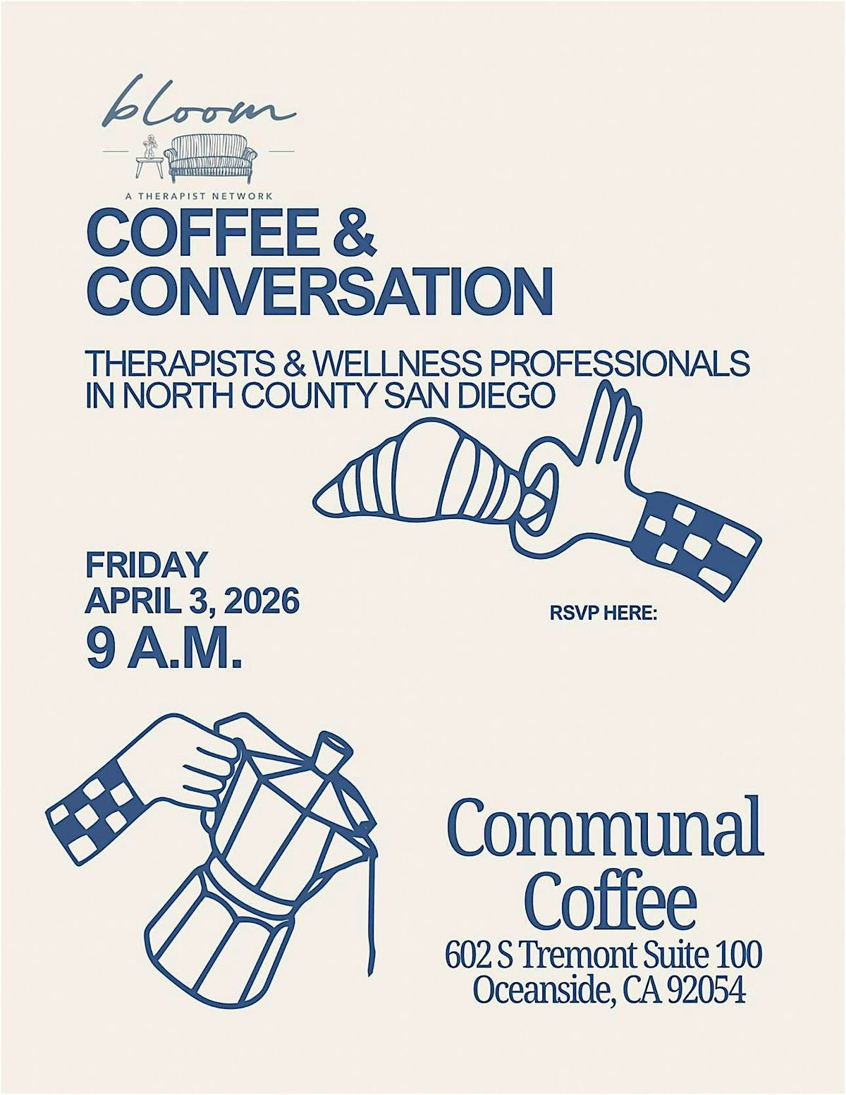 Come join us at Communal Coffee for a relaxing morning on April 3rd, 2026 at 9am. Connect with fellow therapists and welllness pros from the Bloom Therapist Network, share experiences, and enjoy some delicious beverages together. It's the perfect opportunity to unwind, network, and have a great time!