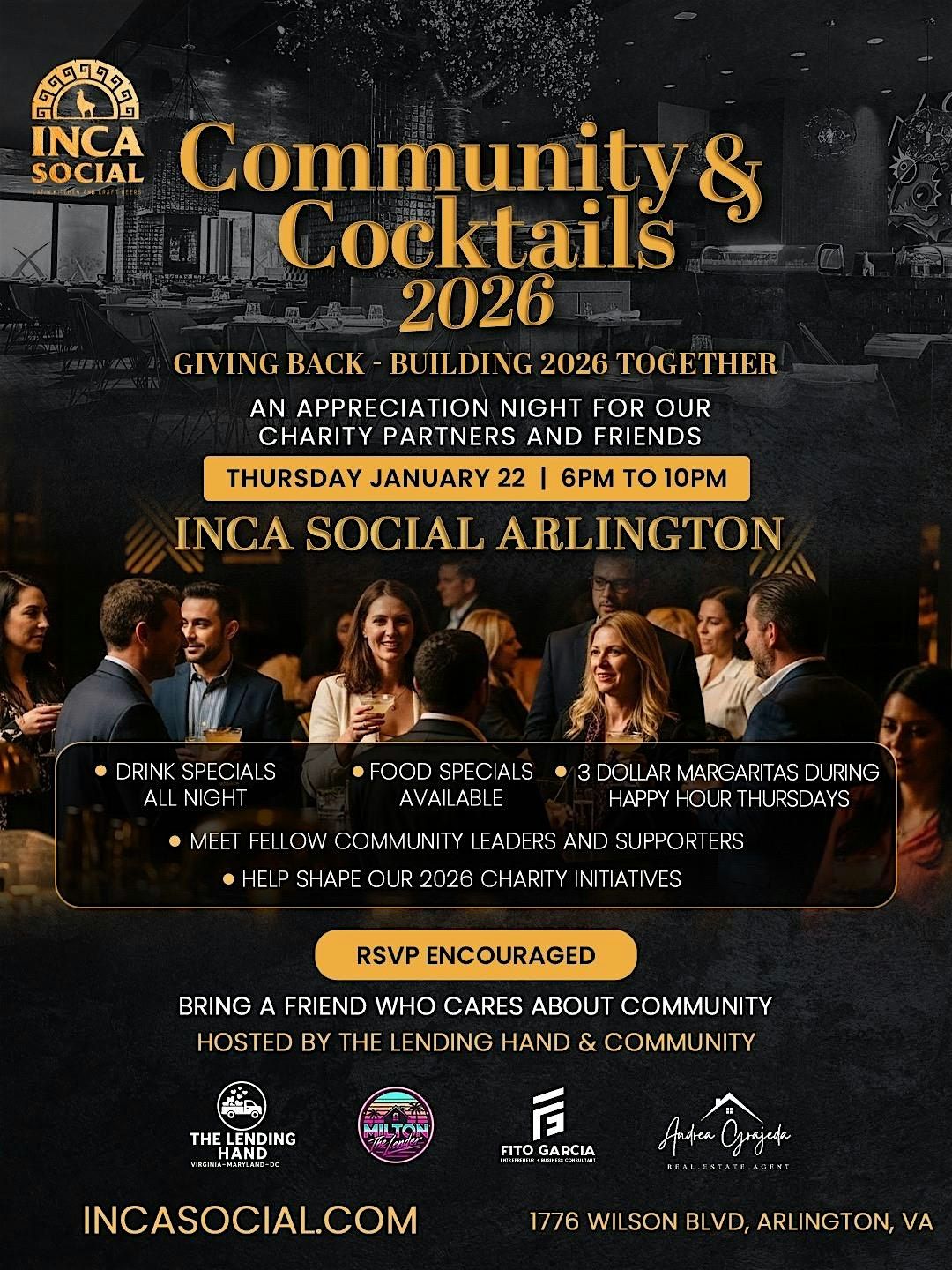 Join us at Inca Social Arlington for Community & Cocktails 2026, an appreciation night dedicated to our charity partners, community leaders, and friends who help make a difference across Arlington, DC, Maryland, and Virginia.