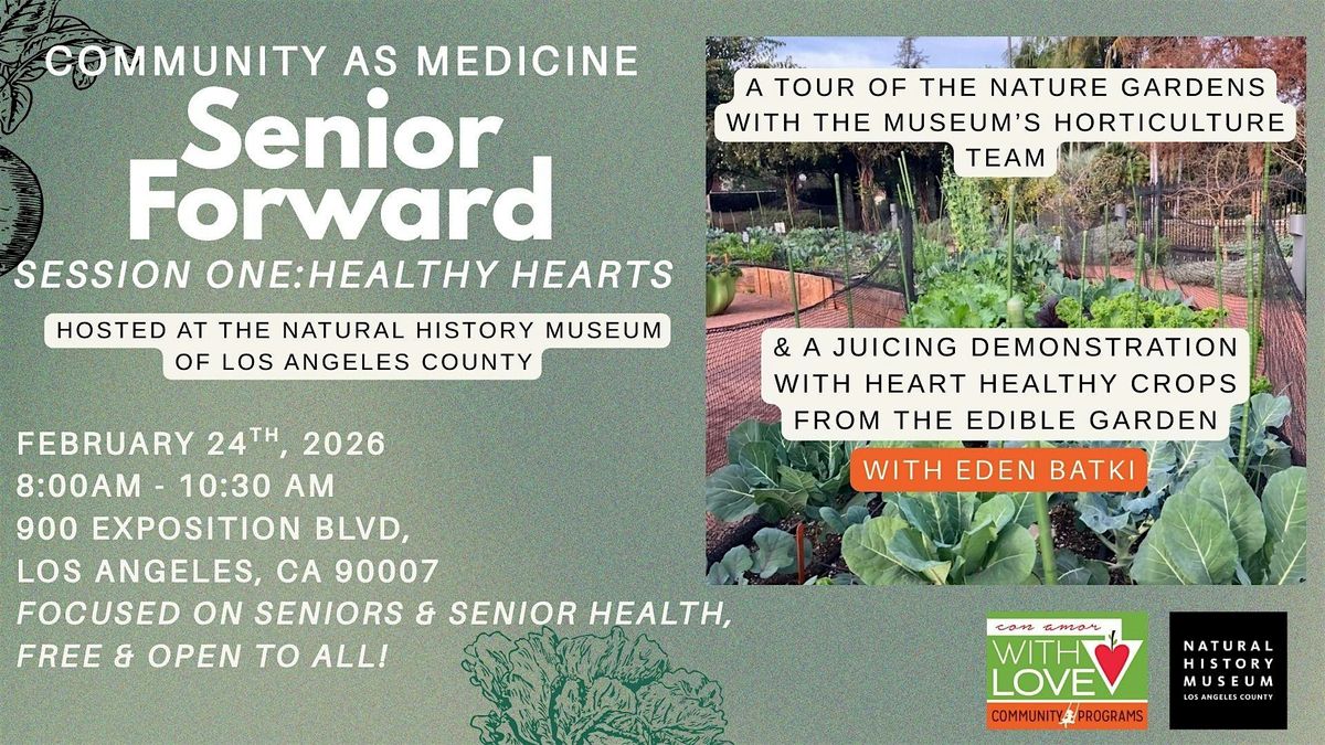 This session focuses on heart healthy crops that are higher in fiber, nitrates, and potassium. We will take a morning walking tour at the Natural History Museum with their horticulture department, followed by a demonstration with Eden Batki who will show us how to use heart healthy crops for easy-to-make juices. Folks will be provided with a free juicer to make their own heart healthy juices at home!
