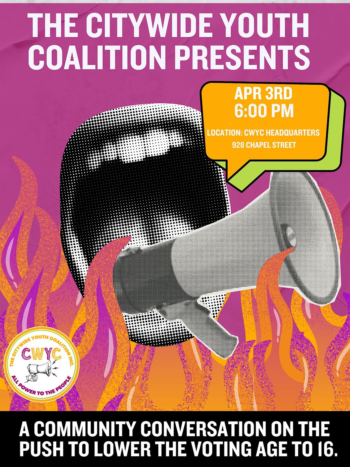 Join Citywide Youth Coalition (CWYC) for a powerful community conversation on the push to lower the voting age to 16. This gathering will create space for young people, community members, and leaders to learn, listen, and share perspectives on expanding voting rights and increasing representation for those most impacted by policy decisions.
