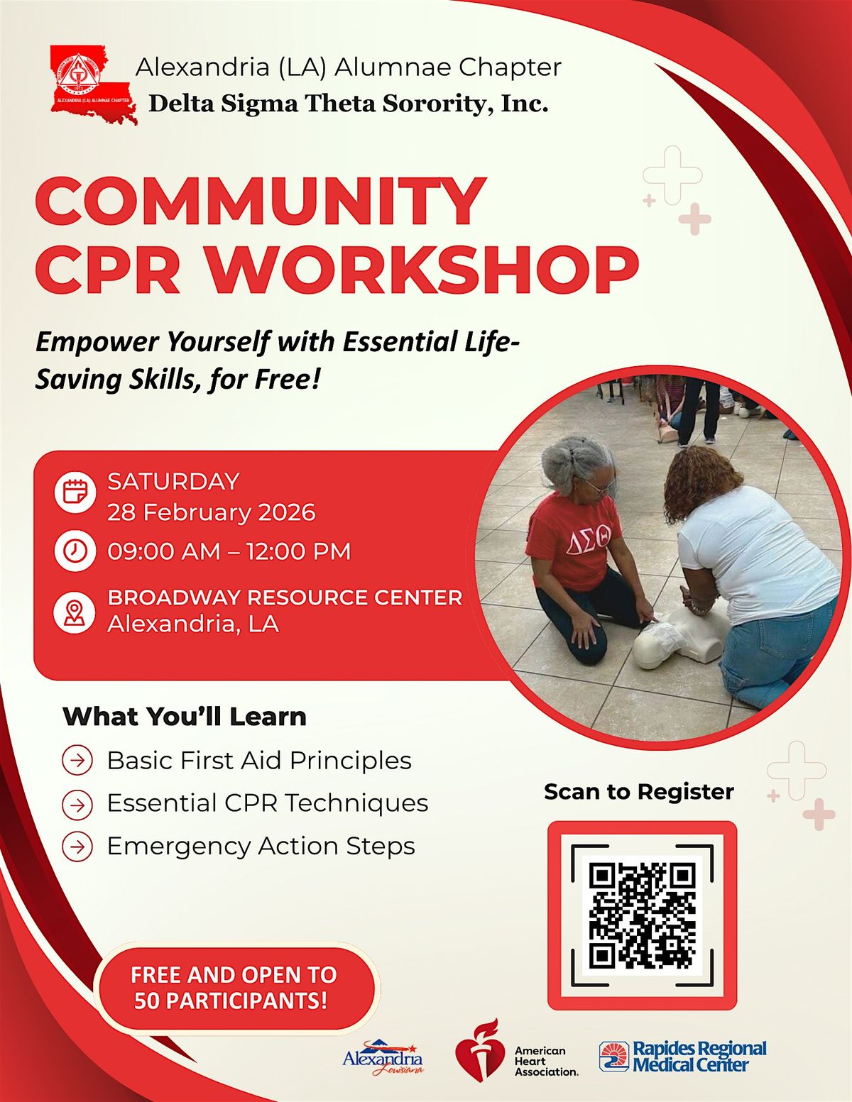 Alexandria (LA) Chapter of Delta Sigma Theta Sorority, Inc., Welcomes you to the Community CPR Workshop happening at the Broadway Resource Center! Join us on February 28, 2026 at 9:00 AM (Central Time) for a hands-on session on life-saving techniques. Learn CPR basics and how to respond in emergency situations. Let's come together to build a safer community. See you there! Thanks to our partners, AHA, City of Alexandria, and Rapides Regional.