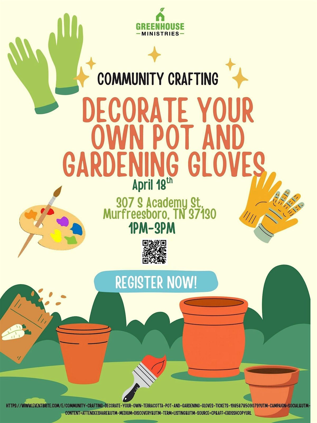 Join us in person for a fun and creative session where you get to personalize your very own terracotta pot and gardening gloves! Whether you're a green thumb or just love cool crafts, this is the perfect chance to get hands-on and make something uniquely yours. Bring your friends or come solo to meet others who love gardening and DIY. All materials are provided—just bring your imagination!