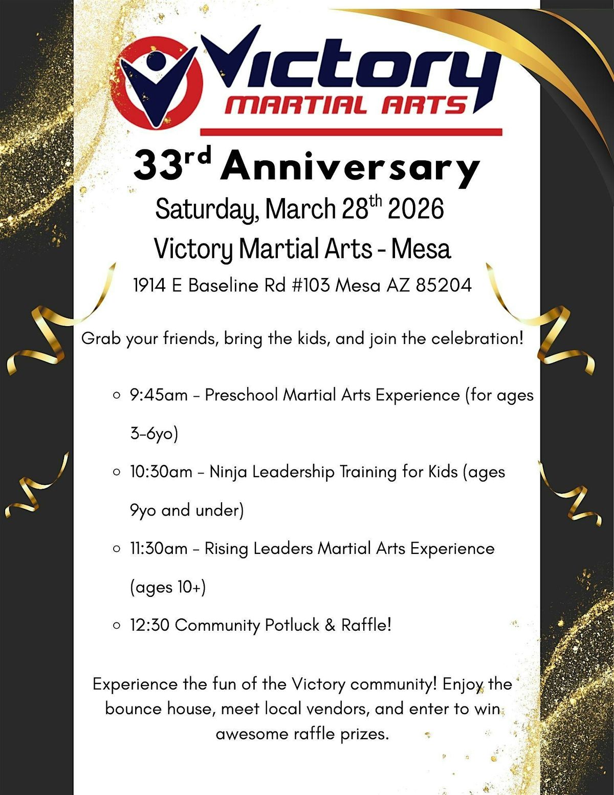 Victory Martial Arts celebrates it's 33rd anniversary with a free community event that helps families to spend time together and learn about confidence, focus, and ready to take on anything.