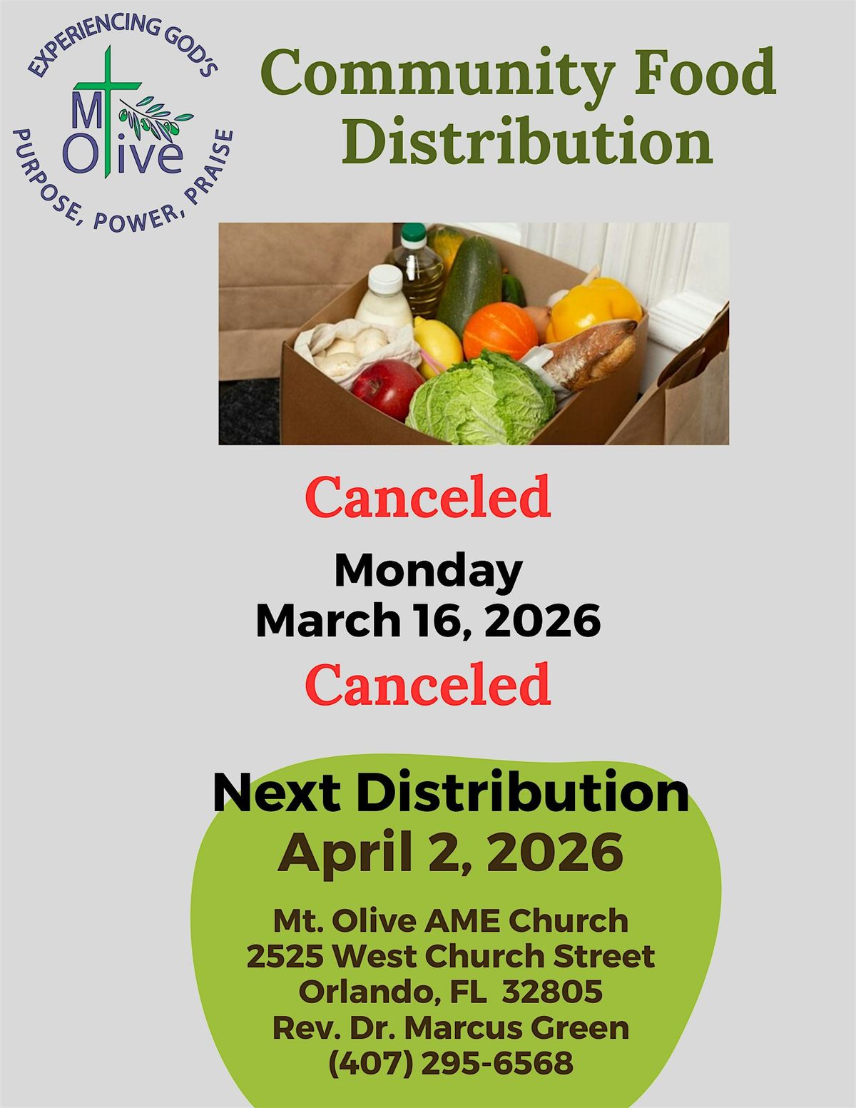 We are committed to providing our Community with access to healthy food. Food is normally distributed the 1st & 3rd Monday of every month but due to a scheduling conflict, distribution on March 16th is cancelled. The next distribution will take place on April 2nd from 1:00 pm - 3:00 pm while supplies last.