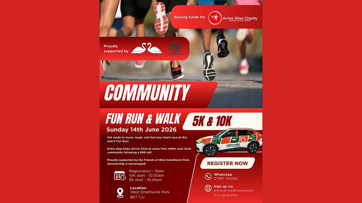 Join our Community 5K & 10K Fun Run & Walk on Sunday 14th June 2026 at West Smethwick Park and help raise vital funds for Arrive Alive Charity. Open to all ages and abilities, whether you run, jog or walk – everyone is welcome. Please note that under 18s must take part with a responsible adult.