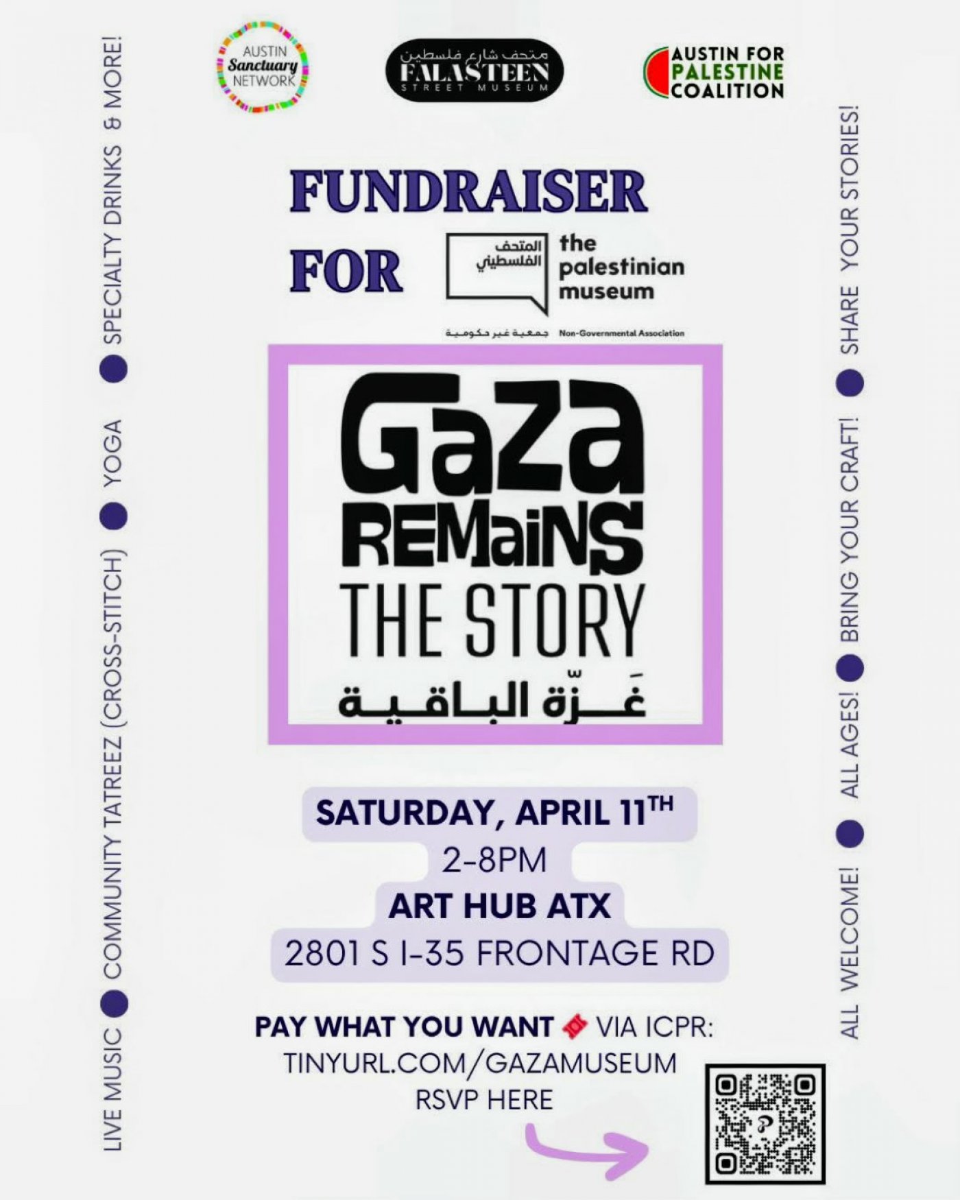 The Austin for Palestine Coalition and Austin Sanctuary Network wants to bring an art exhibit from the Palestinian Museum to Austin — what better way to do that than by making art in community, celebrating Palestinian culture and elevating local immigrant artists!!
