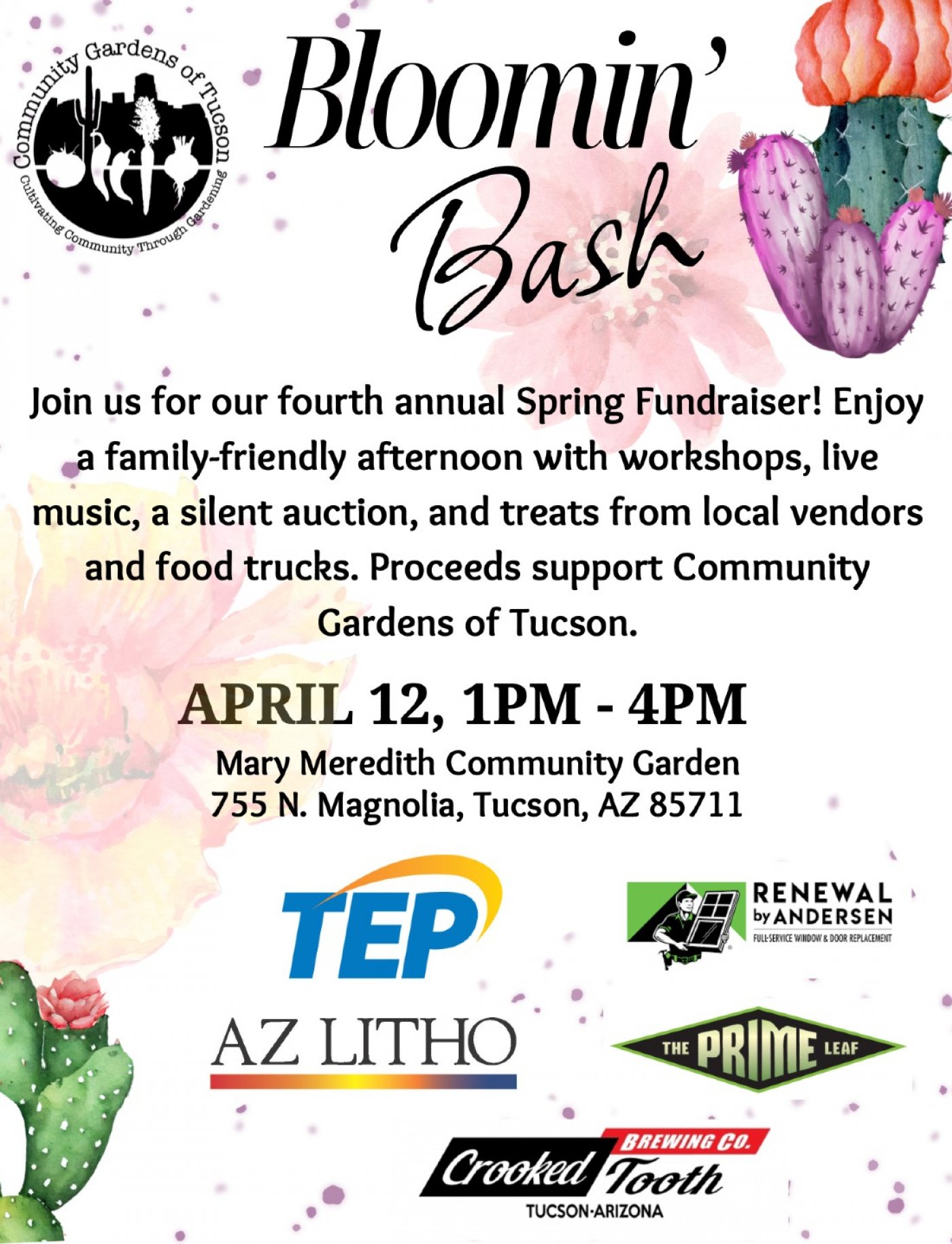 Bloomin’ Bash is a fun, family-friendly celebration honoring the beauty and importance of flowers and blooming plants in Tucson’s gardens, neighborhoods, and the Sonoran Desert. Designed to bring the community together, the event will feature an engaging mix of educational, creative, and culinary experiences.