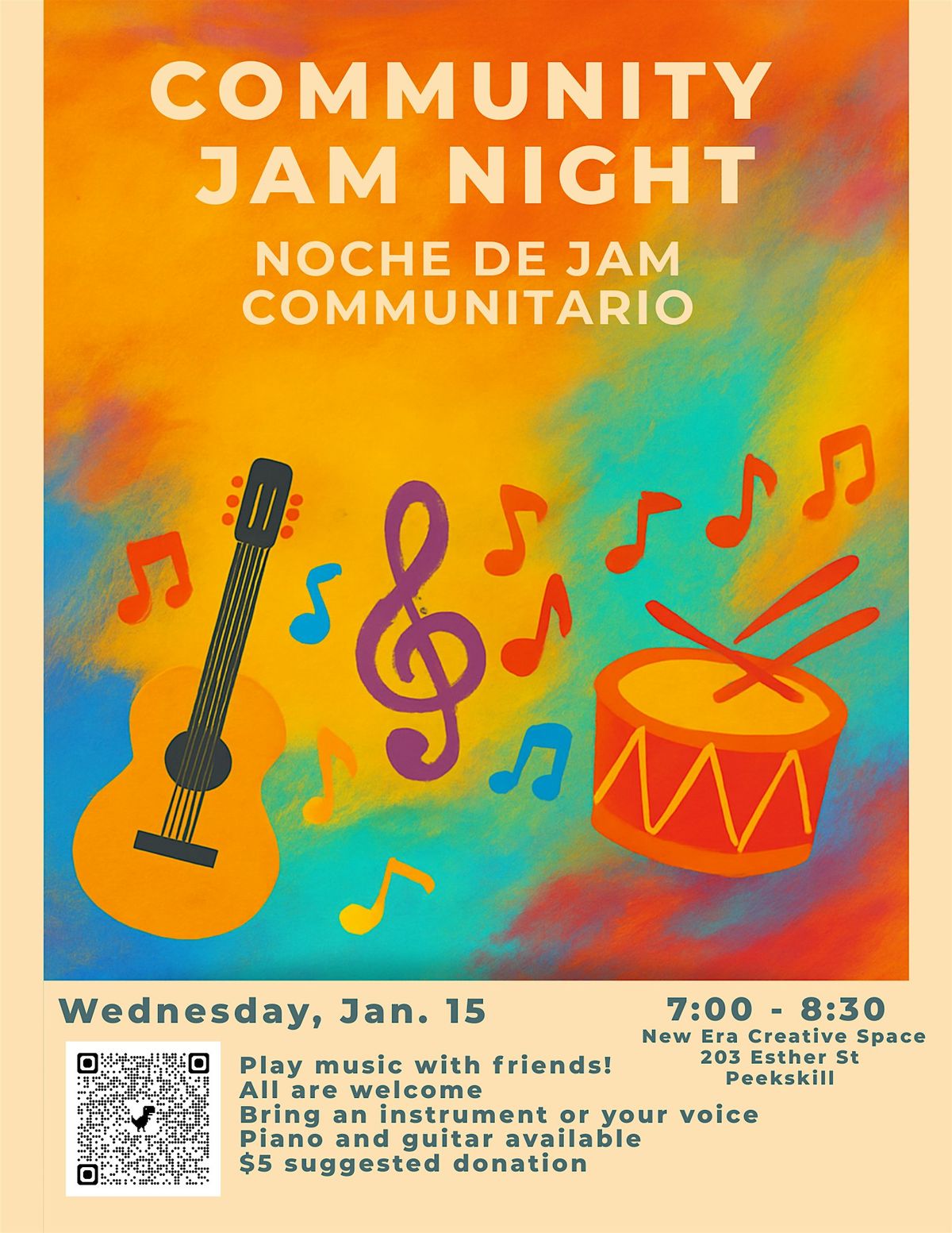 Calling all musicians and music-lovers! Come jam with friends old and new at New Era Creative Space. Piano and guitar available. Bring your instrument and your voice! All ages. Beginners welcome. If you don't want to play, you are welcome to hang out with us too.