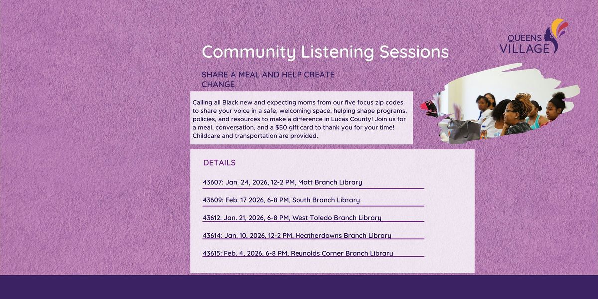 Queens Village invites Black women in 43609 who are pregnant or have given birth in the past 18 months to join our Community Listening Circles. These sessions are a safe space for you to share your experiences and ideas so we can create a stronger, more supportive environment for new and expecting Black women and families!