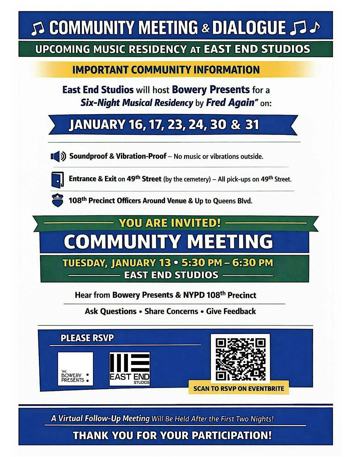 At this meeting, you will hear presentations from Bowery Presents and the NYPD 108th Precinct, and have the opportunity to ask questions, share concerns, and provide feedback.