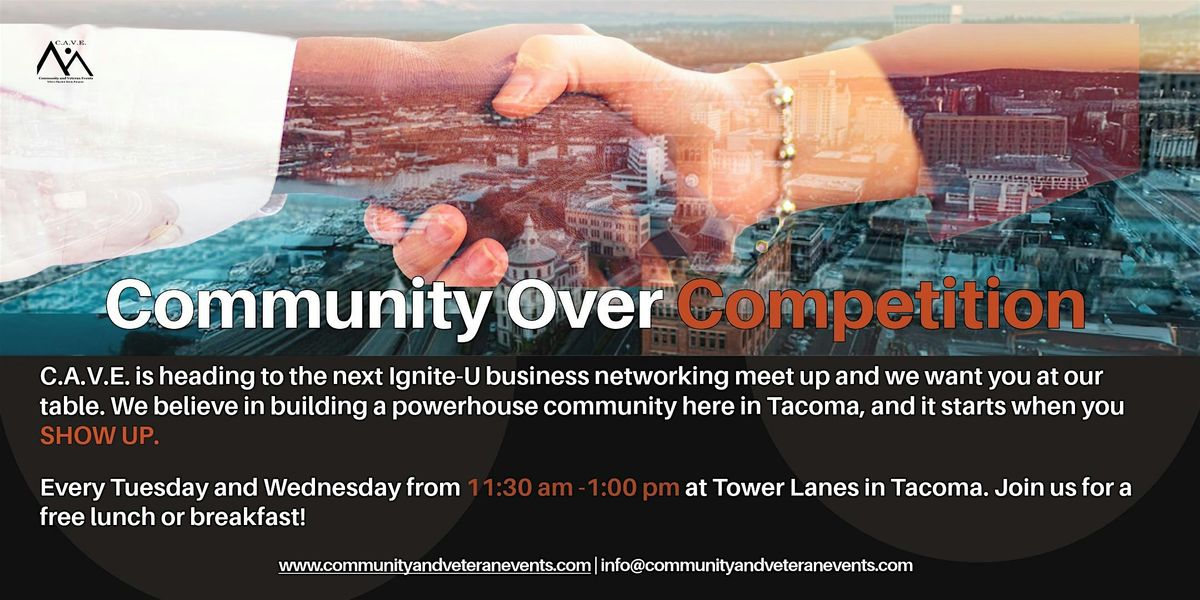 At C.A.V.E., we believe in Community Over Competition. We are a group of dedicated connectors who know that Tacoma’s business landscape is stronger when we move together. We are inviting you to join us for a unique collaboration with Ignite-U, where the goal isn't just to swap business cards—it's to spark genuine partnerships.
