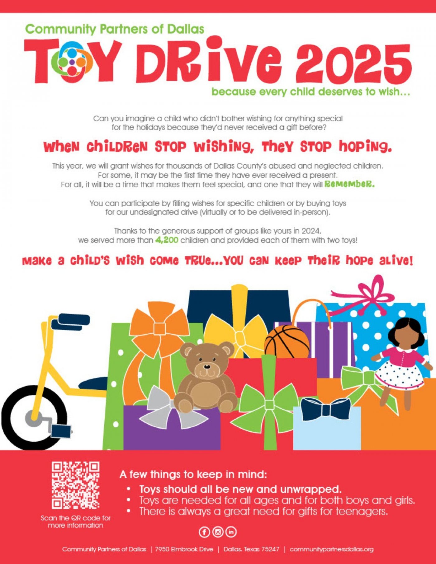 Community Partners of Dallas (CPD) will host its annual toy distribution event on Wednesday, December 17, bringing holiday joy to thousands of children in the Dallas County child welfare system.