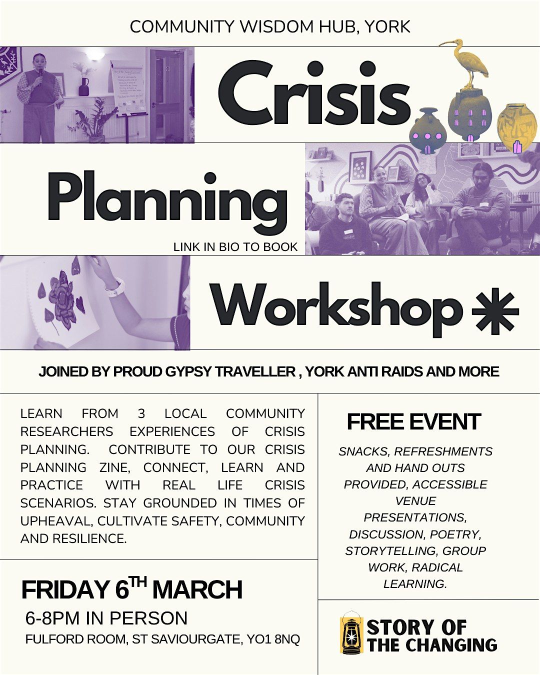 Story Of The Changing is hosting its first Community Wisdom Hub. A radical community led space where we learn about topics we don't get taught about in school. Our first event will be on Crisis Planning, covering the research and practice phases from 3 researchers local to York including Proud Gypsy Traveller and York Anti Raids.