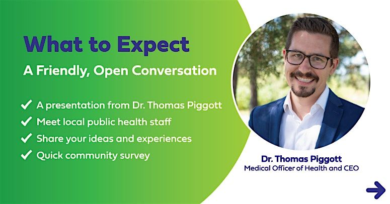 We're inviting the public to this friendly, open coversation with a short presentation from our Medical Officer of Health, Dr. Thomas Piggott, and Lakelands Public Health staff available to talk to you about what public health is, what we do, and answer any questions you may have.