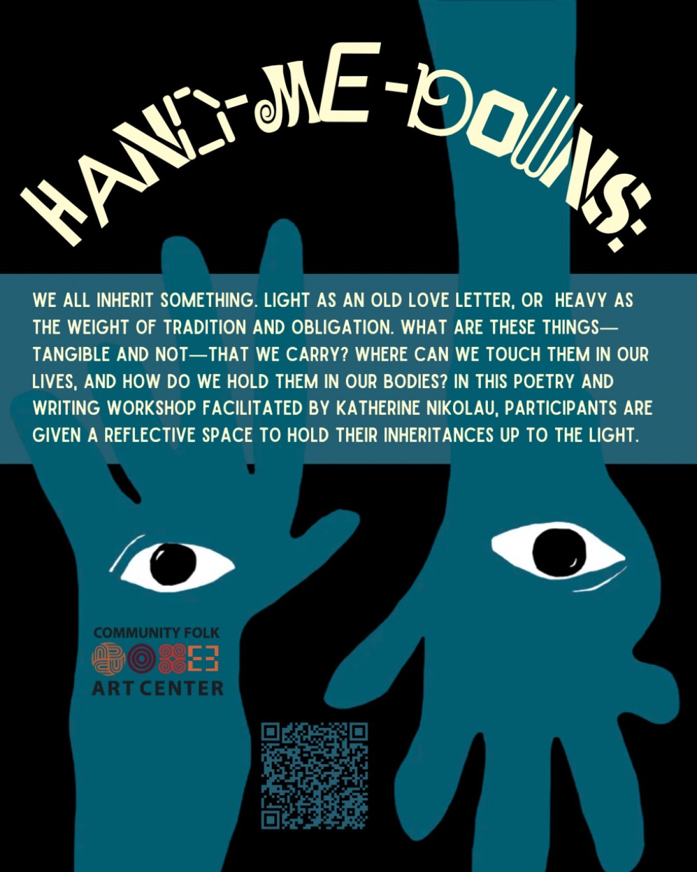 Join us for a fun and relaxed writing workshop with Katherine Nikolau at the Community Folk Art Center. About this workshop: We all inherit something. Light as an old love letter, or heavy as the weight of tradition and obligation. What are these things—tangible and not—that we carry? Where can we touch them in our lives, and how do we hold them in our bodies? In this poetry and writing workshop facilitated by Katherine Nikolau, participants are given a reflective space to hold their inheritances up to the light.