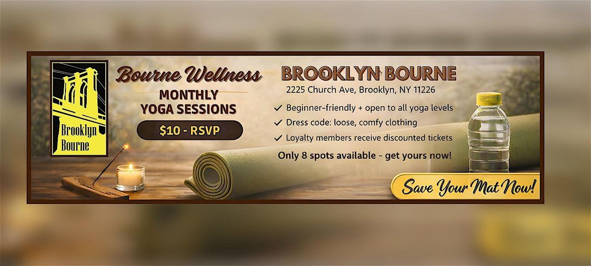 Our Community Yoga sessions take place in the lobby of Brooklyn Bourne, 2225 Church Ave, Brooklyn, NY 11226, Saturday, March 28th 9:15–10:00 AM. Our yoga classes are beginner-friendly and open to all levels.