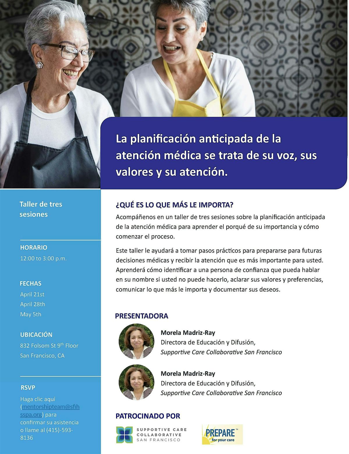 Únase a nosotros para comenzar a reflexionar sobre lo que es más importante para usted. ¿De qué se trata este taller? Usted desempeña un papel fundamental para ayudar a que usted o sus seres queridos reciban atención médica que refleje sus deseos y valores personales. En este taller, usted: