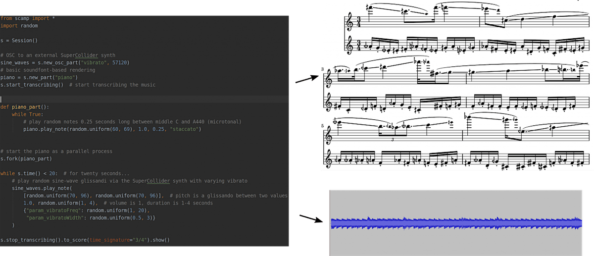 During the first part of the course, we will acquaint ourselves with the SCAMP framework, and with the fundamentals of Python programming (e.g. lists, dictionaries, functions, classes), with an emphasis on exploring the potential of each concept for musical creation. So if you’re brand new to Python—or even to computer programming—you will have an opportunity to learn the basics. On the other hand, if you’re a seasoned Python programmer, this will be an opportunity to focus on the musical potential of Python, and on exploring the more advanced possibilities of the SCAMP framework.