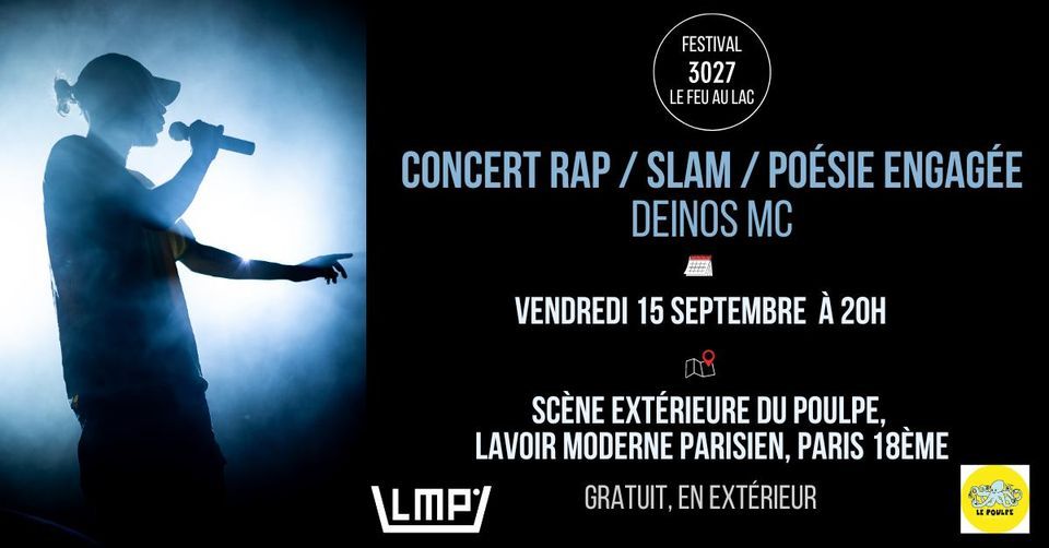 ? Concert RAP / Slam / Poésie engagée de Deinos MC, qui invitera Lelby un bénéficiaire de 3027 sur la scène extérieure du Lavoir Moderne Parisien & de la Ressourcerie Le Poulpe, le vendredi 15 septembre à 20h ?GRATUIT ?