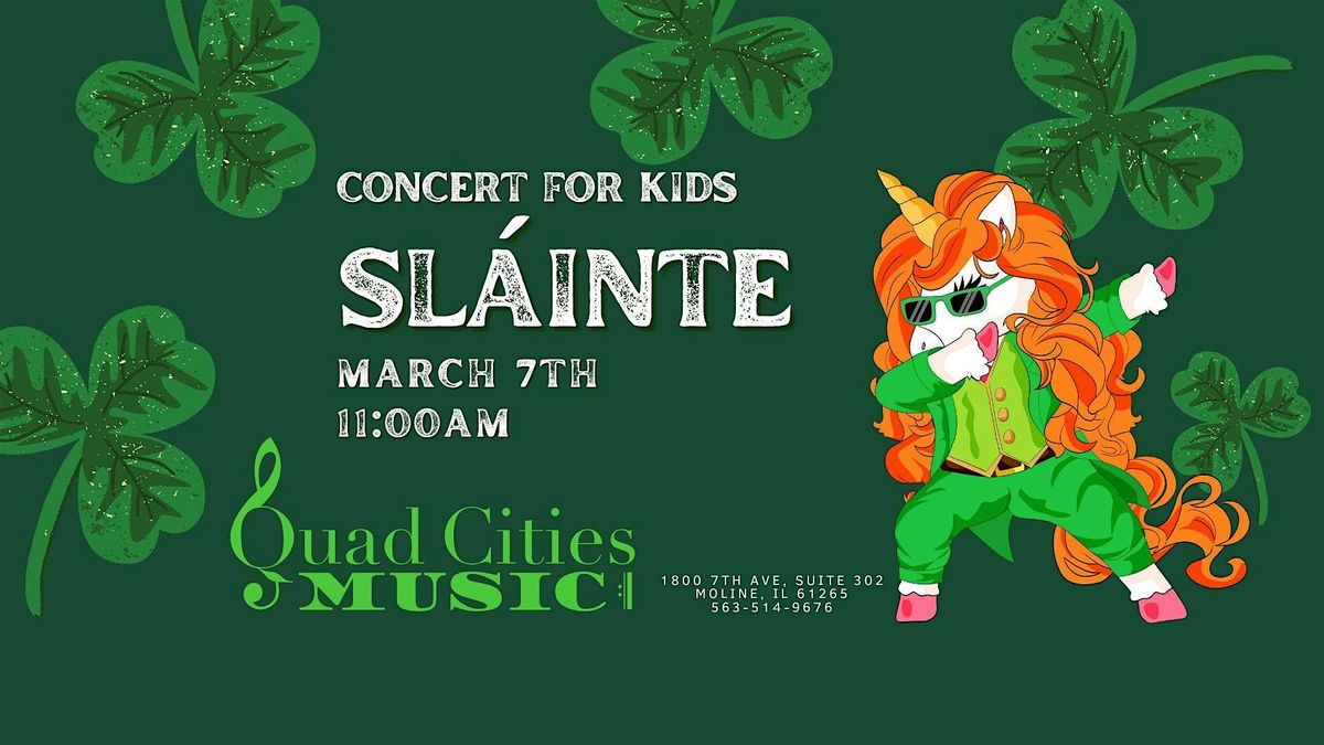 Come join us for a fun-filled morning at Quad Cities Music Therapy for a Concert for Kids - Sláinte! This Concert for Kids will feature the local trio of vocalist Chris Dunn, violinist Heather Turner, and John Kinser on percussion and Bodhran. Get ready for an amazing performance of Irish music that will have the little ones dancing, singing, and playing along. It'll be a blast for the whole family! See you there!