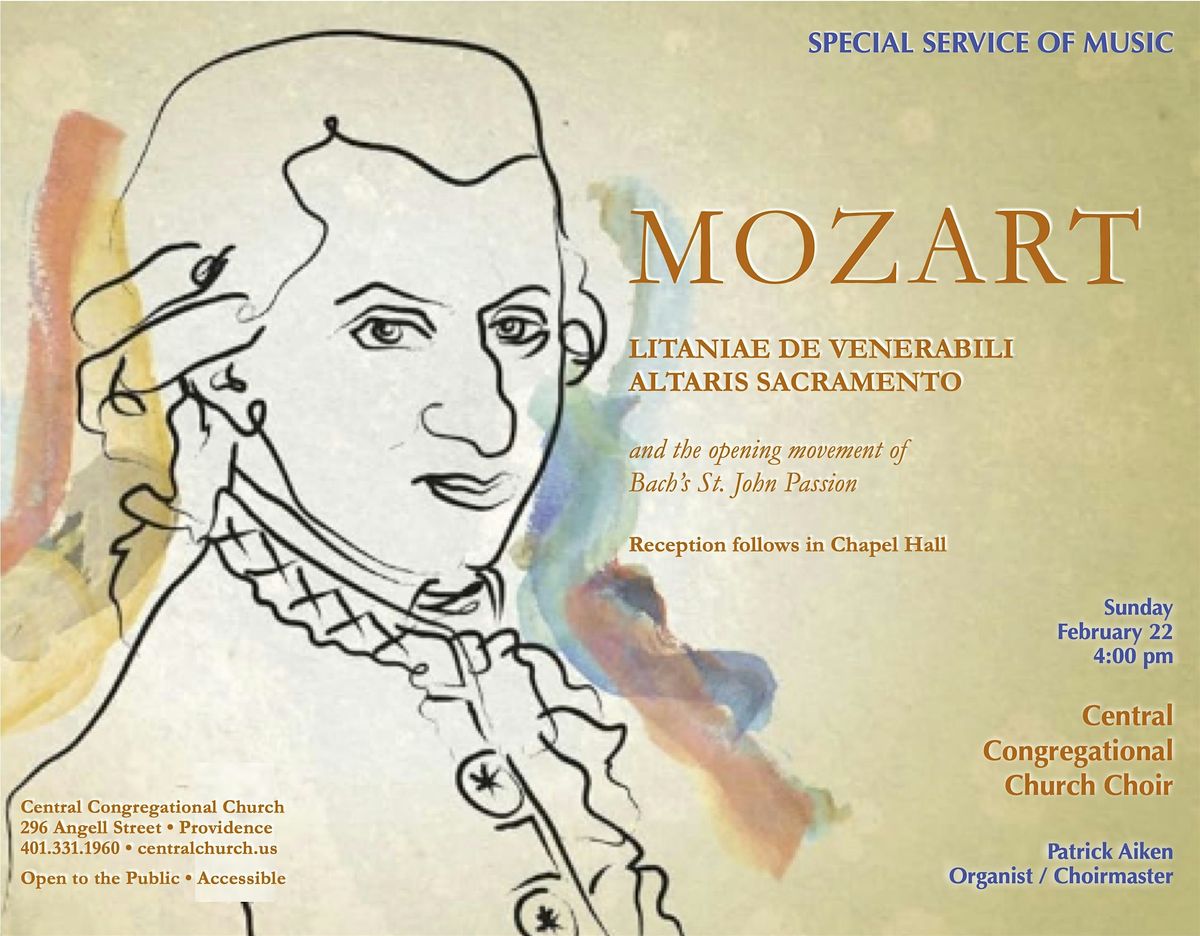 On Sunday, Feb. 22, at 4 pm, the Central Congregational Church Choir will present “Litaniae de venerabili altaris Sacramento,” written in 1776 by Wolfgang Amadeus Mozart – featuring soloists and orchestra. It is the last and most mature of Mozart’s four Litany settings, written when he was just 20 years old! The program also includes the opening movement of Bach’s “St. John Passion.” Patrick Aiken choirmaster / organist.