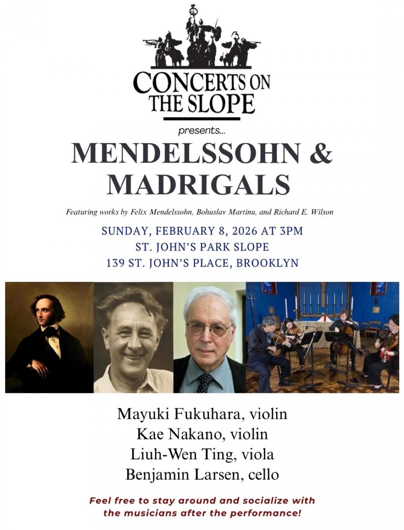Join us for an afternoon of chamber music on February 8 with works that span lyricism, color, and expressive depth. The program pairs Bohuslav Martinů’s Three Madrigals for Violin and Viola—a vibrant, folk-inflected work by the Czech modernist known for his rhythmic vitality and radiant textures—with Richard E. Wilson’s Music for Violin and Cello, a finely crafted example of mid-20th-century American neoclassicism, noted for its clarity, elegance, and expressive restraint. We conclude with Felix Mendelssohn’s youthful and impassioned String Quartet in E-flat Major, Op. 12. St. John’s Park Slope, 139 St. Johns Place, Brooklyn. Subway: Q. Bus: B41, B67, & B69. Tickets: www.concertsontheslope.org