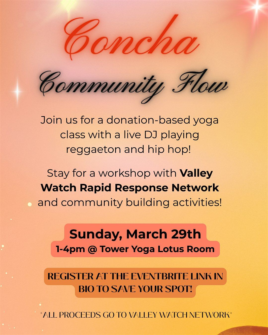 Join Concha x Fresno as we come together to build community and raise money for Valley Watch Network! Nat will lead a donation-based Vinyasa flow Yoga class while DJ Maia will provide some explicit reggaeton and hip hop beats. Stay for a Valley Watch workshop, resources, and and community building activities.