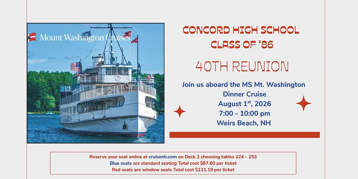 Let's gather for a fun dinner cruise on the MS Mount Washington and catch up with each other! It's been 10 years! We're overdue for a party.About this Event