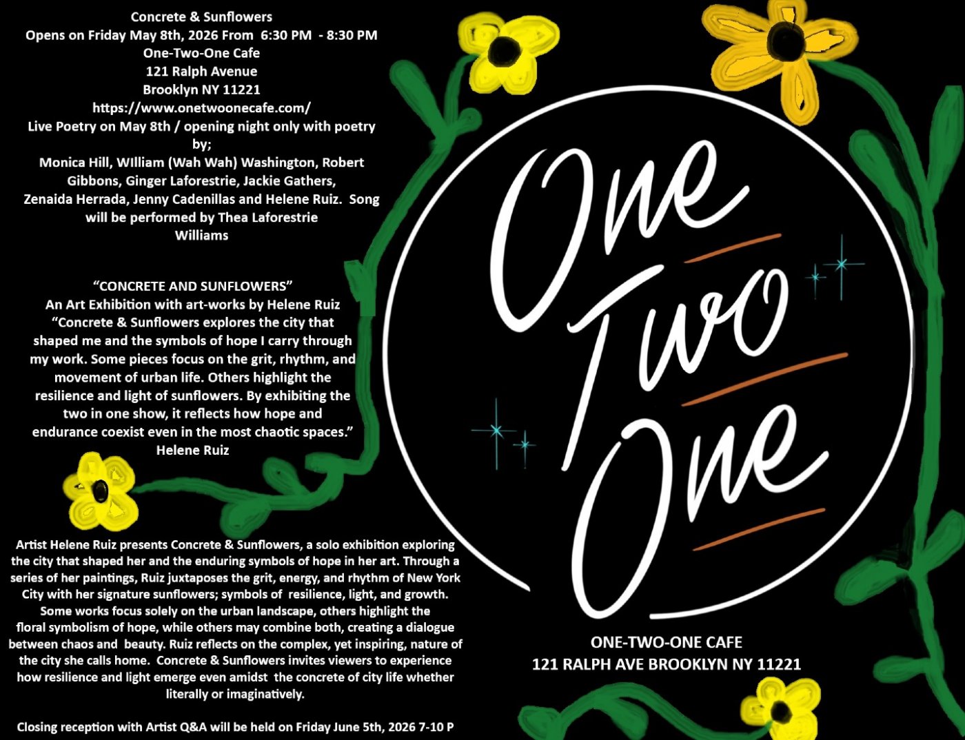 ONE-TWO-ONE CAFE Presents: “CONCRETE AND SUNFLOWERS” An Art Exhibition with art-works by Helene Ruiz “Concrete & Sunflowers explores the city that shaped me and the symbols of hope I carry through my work. Some pieces focus on the grit, rhythm, and movement of urban life. Others highlight the resilience and light of sunflowers. By exhibiting the two in one show, it reflects how hope and endurance coexist even in the most chaotic spaces.” Helene Ruiz Concrete & Sunflowers Opens on Friday May 8th, 2026 From 6:30 PM - 8:30 PM One-Two-One Cafe 121 Ralph Avenue Brooklyn NY 11221 https://www.onetwoonecafe.com/ Live Poetry on May 8th / opening night only with poetry by; Monica Hill, WIlliam (Wah Wah) Washington, Robert Gibbons, Ginger Laforestrie, Jackie Gathers, Zenaida Herrada, Jenny Cadenillas and Helene Ruiz. Song will be performed by Thea Laforestrie Williams Artist Helene Ruiz presents Concrete & Sunflowers, a solo exhibition exploring the city that shaped her and the enduring symbols of hope in her art. Through a series of her paintings, Ruiz juxtaposes the grit, energy, and rhythm of New York City with her signature sunflowers; symbols of resilience, light, and growth. Some works focus solely on the urban landscape, others highlight the floral symbolism of hope, while others may combine both, creating a dialogue between chaos and beauty. Ruiz reflects on the complex, yet inspiring, nature of the city she calls home. Concrete & Sunflowers invites viewers to experience how resilience and light emerge even amidst the concrete of city life whether literally or imaginatively. Closing reception with Artist Q&A will be held on Friday June 5th, 2026 7-10 P