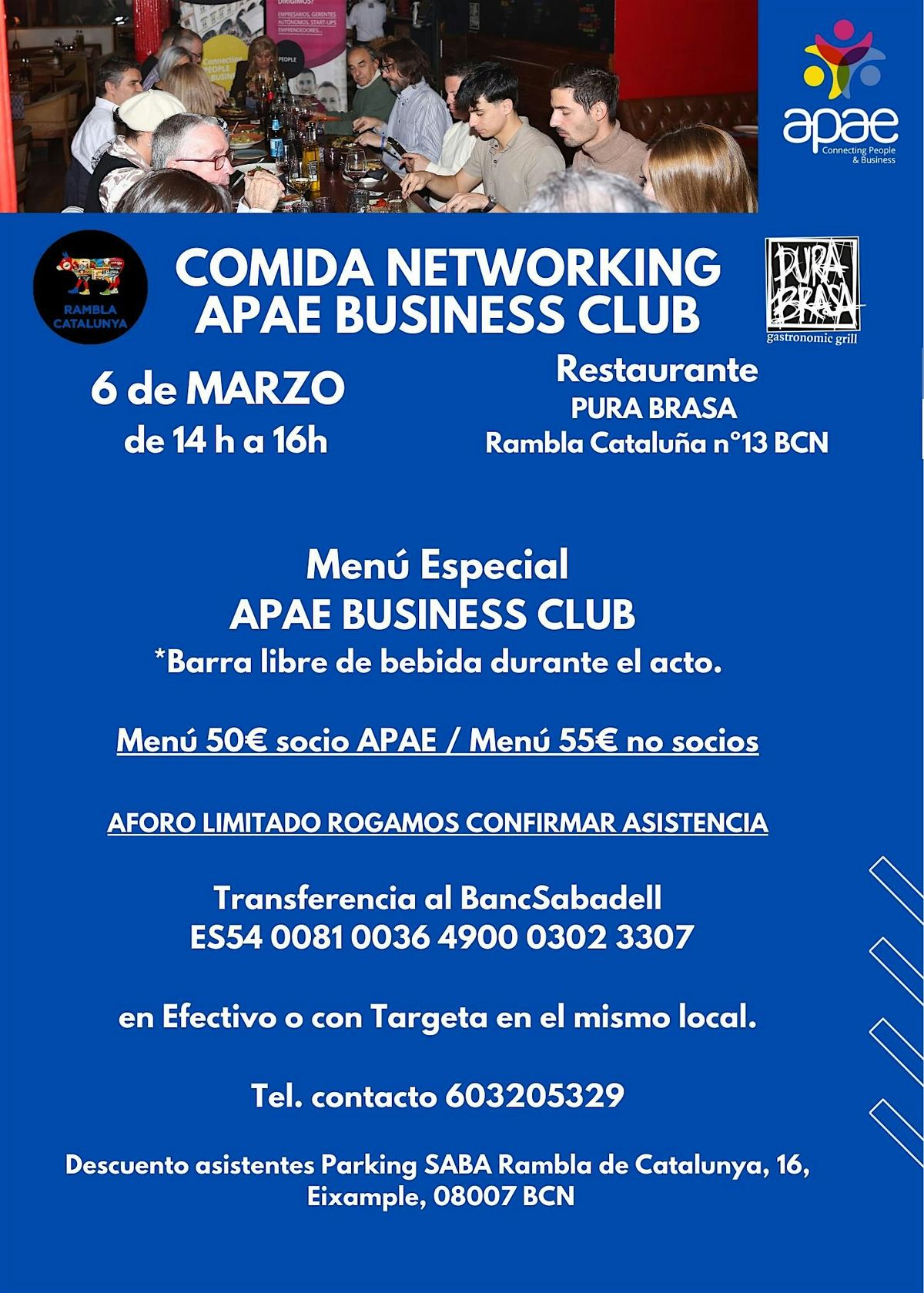 Este viernes 6 de marzo, el APAE Business Club abre sus puertas en Pura Brasa para un encuentro exclusivo: empresarios y autónomos seleccionados compartirán ideas, explorarán oportunidades y forjarán alianzas que mueven negocios.