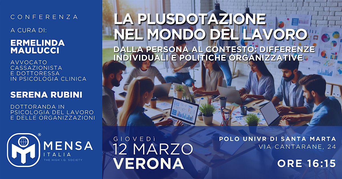 All’interno di un evento organizzato dall’Università di Verona, presso il Polo di Santa Marta ci sarà l’intervento di due Socie del Mensa Italia che parleranno di “La plusdotazione nel mondo del lavoro - Dalla persona al contesto: differenze individuali e politiche organizzative”.