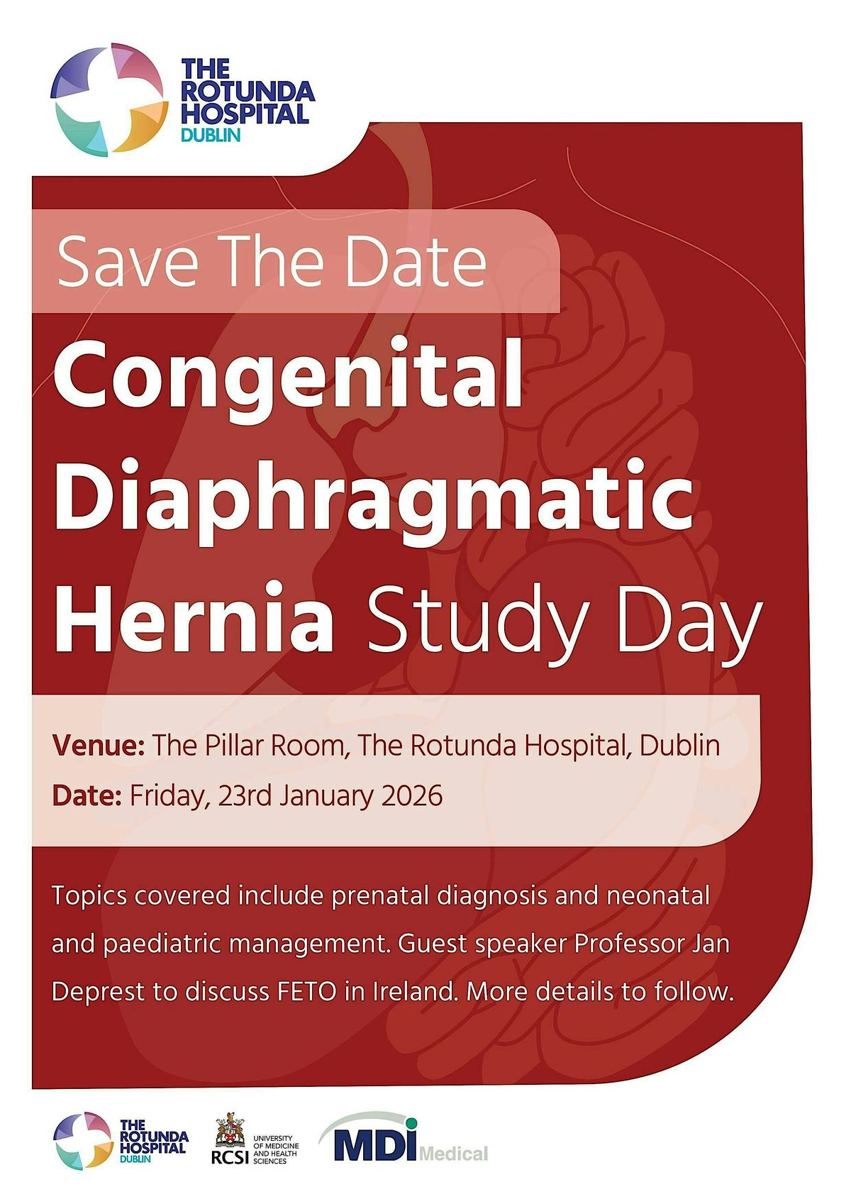 Topics covered include prenatal diagnosis and neonatal and paediatric management. Guest speaker Professor Jan Deprest to discuss FETO in Ireland.