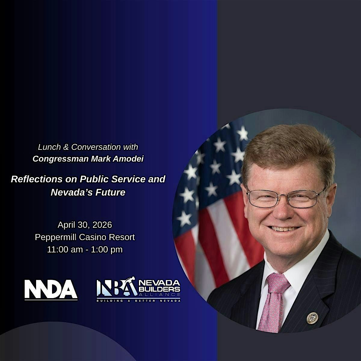 Join us for lunch and a conversation with Mark Amodei as he reflects on his years representing Nevada and his decades of public service. Congressman Amodei will share insights from his time in Congress, discuss key policy decisions that have shaped Nevada’s growth, and offer his perspective on the future of Washington and its impact on our state.