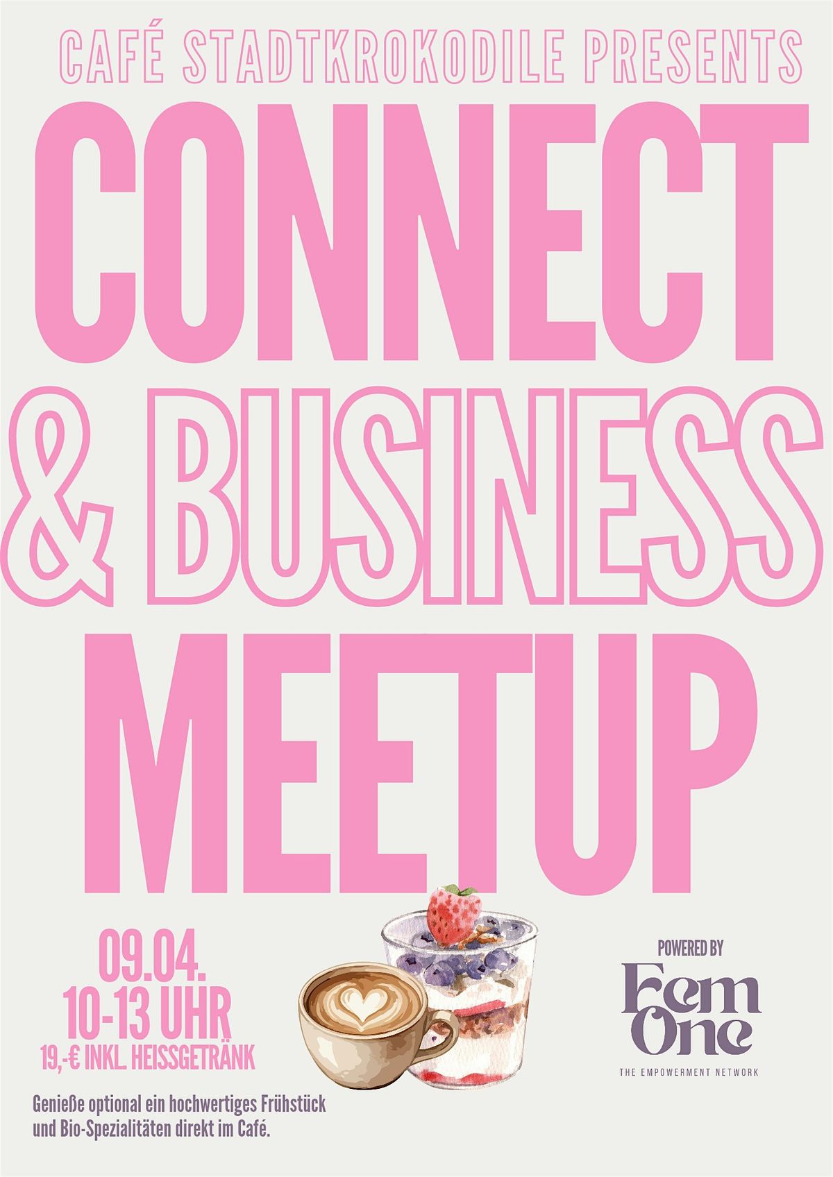 Mit dem FemOne Connect & Business Meetup laden wir dich ein zu einem inspirierenden Vormittag im Café Stadtkrokodile, einem Ort, der verbindet, entspannt und Raum für echte Begegnungen schafft.