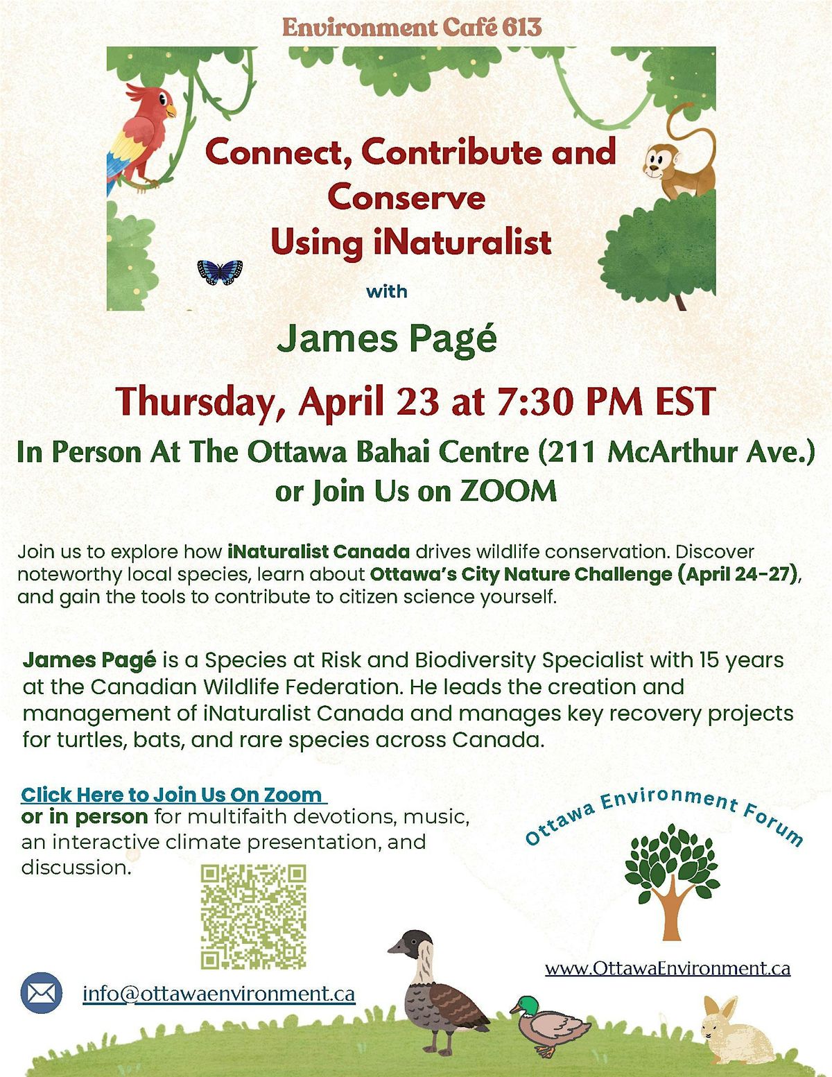Imagine snapping a photo of an unusual plant or bird in your garden or on your next nature hike, then instantly contributing to global wildlife conservation—anyone can do it, anytime, anywhere! That's the power of iNaturalist, and you'll discover how at our upcoming Environment Café 613 presentation led by James Pagé, species at risk and biodiversity specialist at the Canadian Wildlife Federation for 15 years.