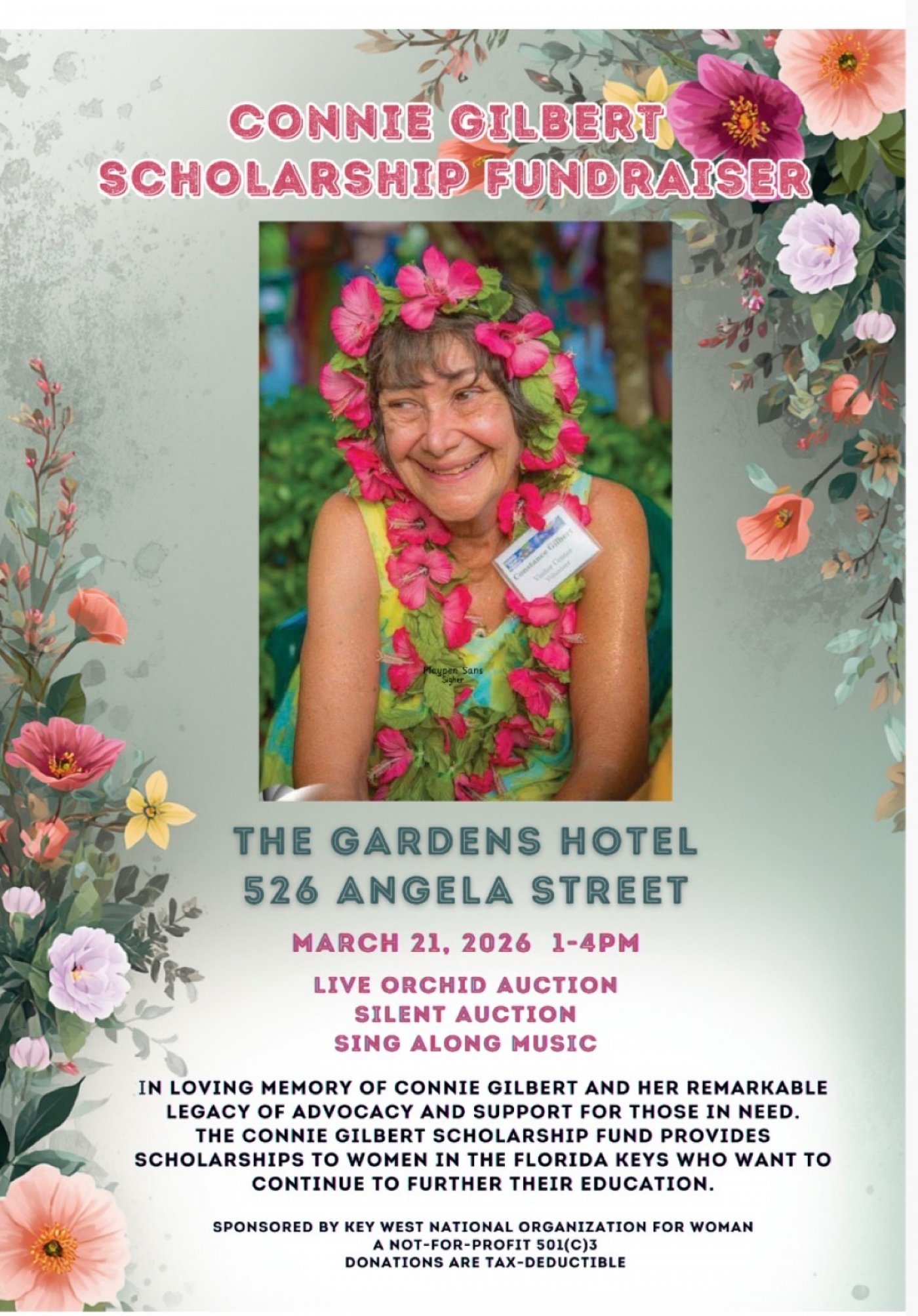The Key West Chapter of the National Organization for Women invite you to our 2026 fundraiser for scholarships for Florida Keys Women. We honor Connie Gilbert, one of our Chapter organizers, an activists, poet, dynamic defender of human rights.