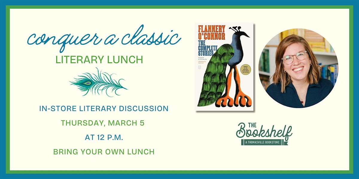 Get your ticket to The Bookshelf's Conquer a Classic Literary Lunch in the shop on Thursday, March 5 at 12 p.m.! You'll learn how to join our year-long Conquer a Classic book club: a community read of Georgia author Flannery O'Connor's .Bring your own lunch, learn about our Conquer a Classic book club, and connect with local readers!Annie B. Jones will also lead a discussion of the stories our Conquer a Classic book club read in February from The Complete Stories.Tickets are $5 (plus fees), and $5 goes toward your Bookshelf purchase on Thursday, March 5. Tables and chairs will be set up in the shop.