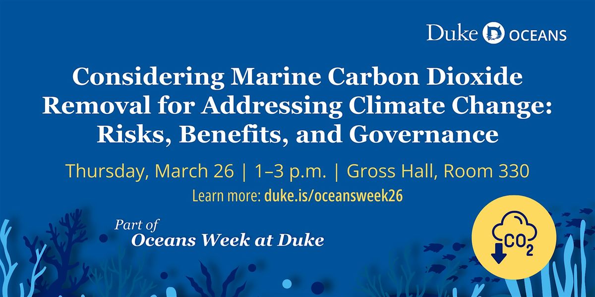 As the world faces escalating impacts of climate change, innovative solutions are urgently needed to reduce greenhouse gases in the atmosphere. Marine Carbon Dioxide Removal (mCDR) represents a potentially powerful tool to help mitigate this crisis by harnessing the ocean’s natural ability to absorb and store carbon. Expert Wil Burns, Co-Director for the Institute for Responsible Carbon Removal at American University, will be joined by Duke faculty, researchers, and students in a panel discussion to explore the science, policy, and implications surrounding mCDR approaches, examining whether they can be developed safely, viably, and at scales that matter for climate mitigation. Duke is a partner of Oceans Visions in advancing collaborative research to better understand the full potential and risks of mCDR technologies.