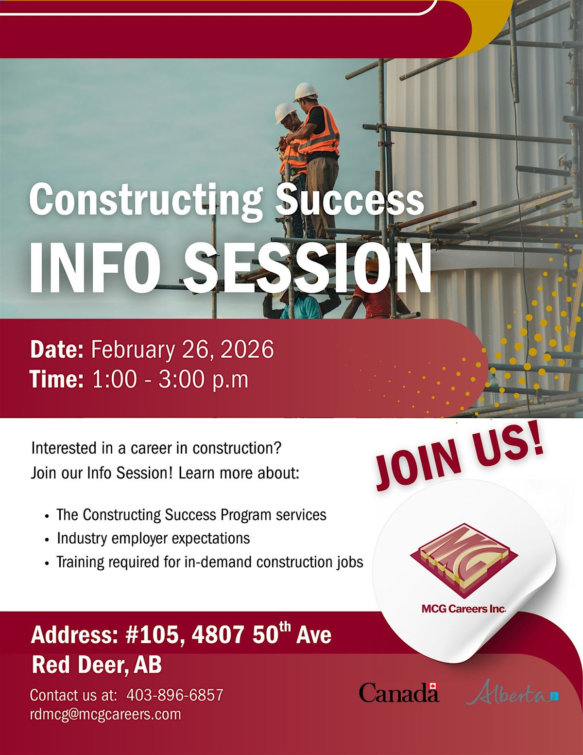 Join us in person for a two-hour information and networking session hosted by MCG Careers Inc. Participants will hear from industry professionals and learn how the Constructing Success program supports individuals entering construction-related careers.
