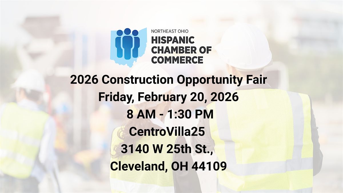 You're invited to the 2026 Construction Opportunity Fair, hosted by the Northeast Ohio Hispanic Chamber of Commerce on Friday, February 20th, 2026, from 8:00 AM to 1:30 PM at CentroVilla25, 3140 W 25th St., Cleveland, OH 44109.