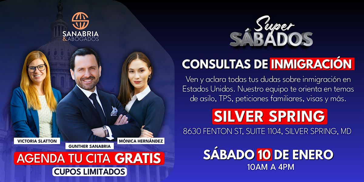 Consulta legal gratuita con abogados de inmigración en Silver Spring . Este sábado 10 deenero ennuestras oficinas de Sanabria & Associates (Silver Spring ) revisaremos tu caso y te guiaremos en tus próximos pasos. Cupos limitados — Reserva tu cita ahora.