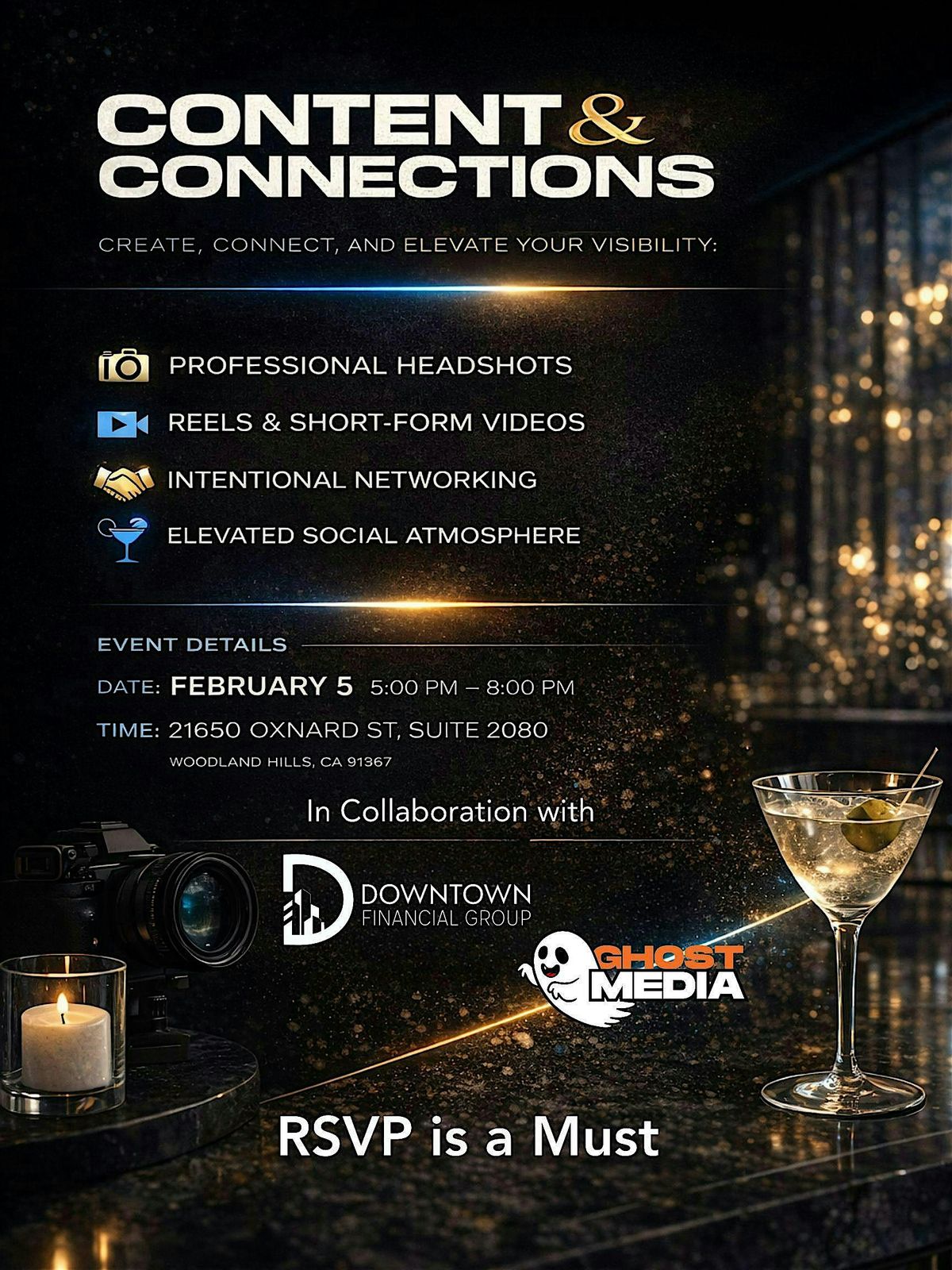 Content & Connections is an elevated networking and media experience designed for realtors who want to stand out, build authentic relationships, and leave with brand-ready content.