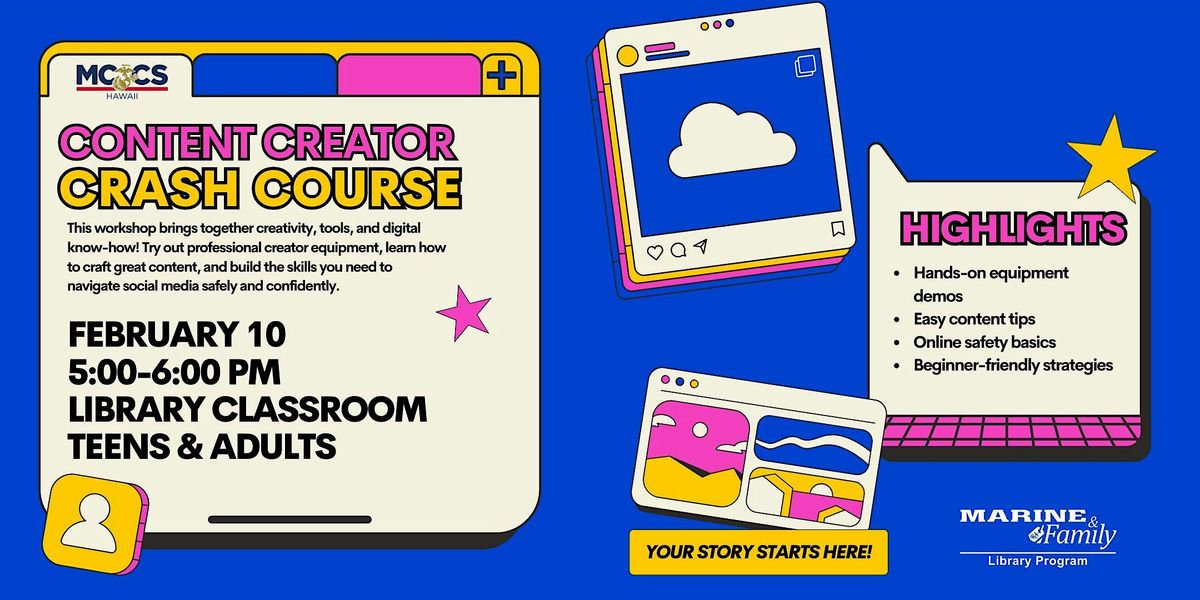 In partnership with MCCS Marketing, participants will get a behind-the-scenes look at how content is planned and produced, along with a hands-on demonstration of content creation tools used by professionals. Learn tips for creating engaging posts, building an online presence, and staying safe online.