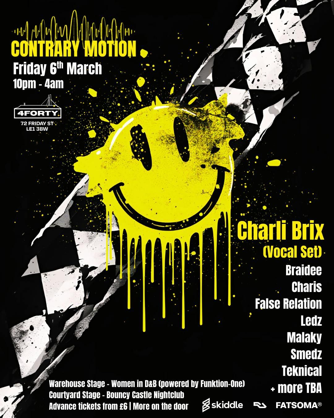 Charli Brix (Vocal Set) at Contrary MotionFriday 6th March 2026 | 10pmβ4am440, Friday Street, LeicesterHeadlined by Charli Brix, Contrary Motion returns with a night dedicated to forward-thinking Drum & Bass and underground energy.